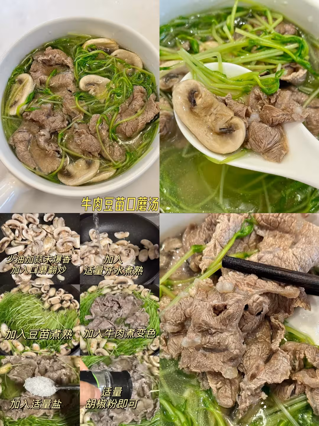 ✅第六款:牛肉豆苗口蘑湯 準備食材:豆苗、口蘑、牛肉、蒜末 配料:食鹽、胡椒粉