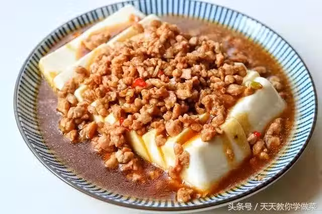 10.蒸好的豆腐表面撒上蔥末和紅椒絲。
