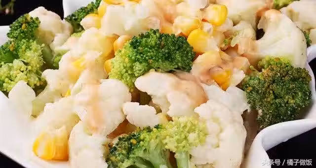7 把煮熟的西藍花、玉米粒、花菜裝入乾淨的器皿中。