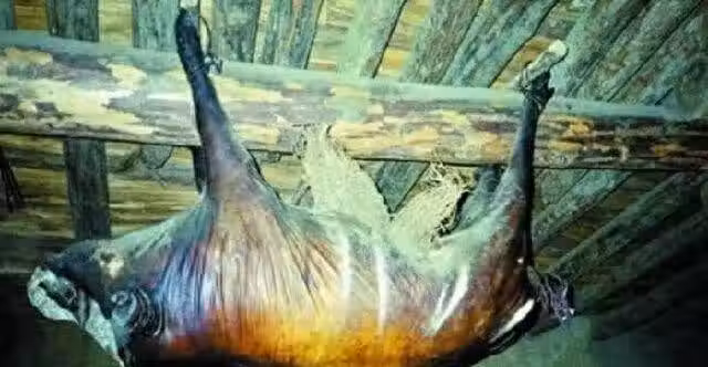 等肚子裡的「干枝」能吸干裡面的是水分的時候,就可以將它們拿出來,這些干枝採用草木灰吸干水分的原理。然後再將豬肉掛在房樑上面,等家裡來貴賓才會拿出來,掛起來的時間越久,就越珍貴。