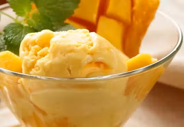 取出冰箱中的芒果冰淇淋,用冰淇淋勺舀入碗中,即可享用。