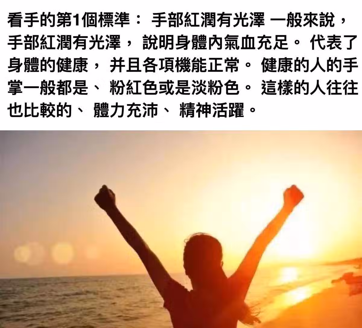 看手的第1個標準:手部紅潤有光澤一般來說,手部紅潤有光澤,說明身體內氣血充足。代表了身體的健康,並且各項機能正常。健康的人的手掌一般都是、粉紅色或是淡粉色。這樣的人往往也比較的、體力充沛、精神活躍。