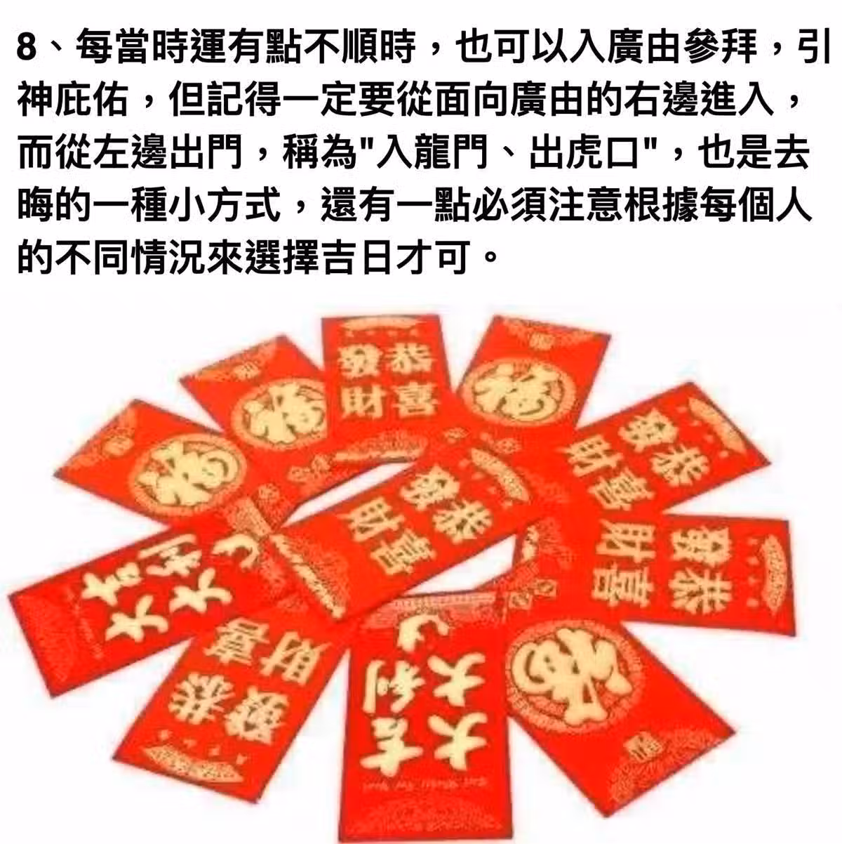 8、每當時運有點不順時,也可以入廣由參拜,引神庇佑,但記得一定要從面向廣由的右邊進入,而從左邊出門,稱為"入龍門、出虎口",也是去晦的一種小方式,還有一點必須注意根據每個人的不同情況來選擇吉日才可。