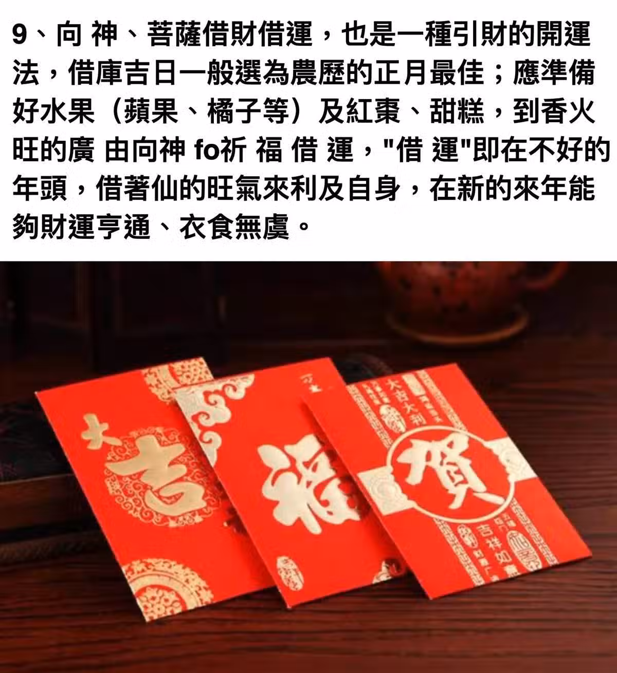 9、向 神、菩薩借財借運,也是一種引財的開運法,借庫吉日一般選為農歷的正月最佳;應準備好水果(蘋果、橘子等)及紅棗、甜糕,到香火旺的廣 由向神佛祈 福 借 運,"借運"即在不好的年頭,借著仙的旺氣來利及自身,在新的來年能夠財運亨通、衣食無虞。