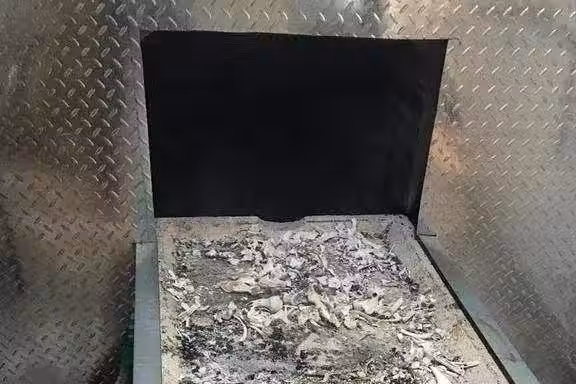 燃燒40分鐘到一個小時,就可以推出來了。骨灰不是粉狀的。這是一塊骨頭。大腿骨比較難燒,所以看起來比較完整。需先將其搗碎,方可入甕。否則,將不會化為灰燼的