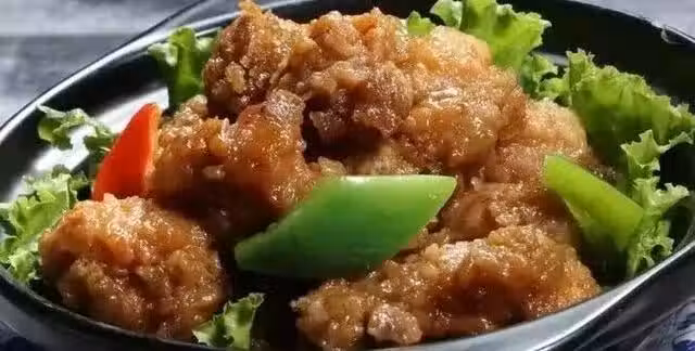 3.取一份雞塊,潷掉原湯,裝入底部墊有生菜葉的砂鍋中,澆入醋汁,點綴青紅椒片即可走菜。