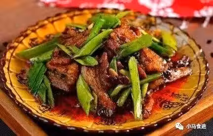 2. 鍋置旺火上,加入混合油燒熱,下入肉片煸炒出香,肉片起卷出油加入豆瓣和豆豉炒香炒出色,調入鹽、醬油炒勻,最後下入青蒜苗炒勻即可出鍋裝盤。