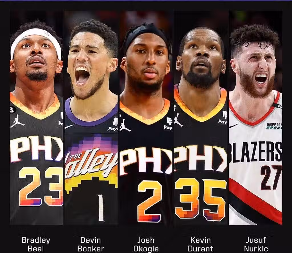 太陽囤積了大量身高在198-208這個區間的球員,他們的陣容兼備高度和空間感,極其現代化。幾乎沒有純正1號位的他們,將用比爾擔任主控,剩餘球權由杜蘭特、布克等人輪流消化。在三巨頭身邊,有多名球員上賽季三分命中率超過37%,李(44.5%)、渡邊(44.4%)、阿倫(39.9%)迪奧普(39.4%)、尤班克斯(38.9%)和戈登(37.1%)。