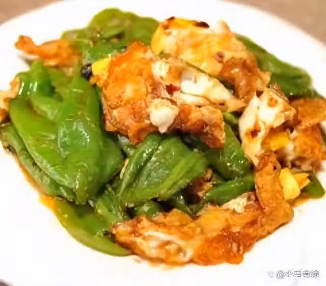 虎皮青椒炒煎蛋,這道菜與上一道五花肉炒荷包蛋做法略微相似,多了一步,青椒需要提前煸一下,炒出虎皮來,煸炒的作用可以有效地去掉青椒的糟辣味,辣味沒有那麼突出,適合大眾的口味。