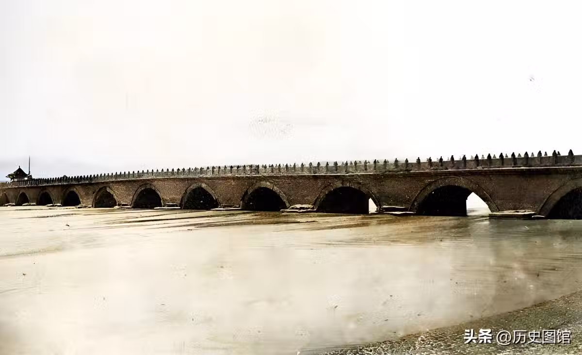 這是位於北京城南的盧溝橋,該橋為十一孔聯拱橋,全長266.5米。橋身造型優美,橋上有281根望柱,柱頭上立著281隻栩栩如生的石獅子。這張照片拍攝於1877年。