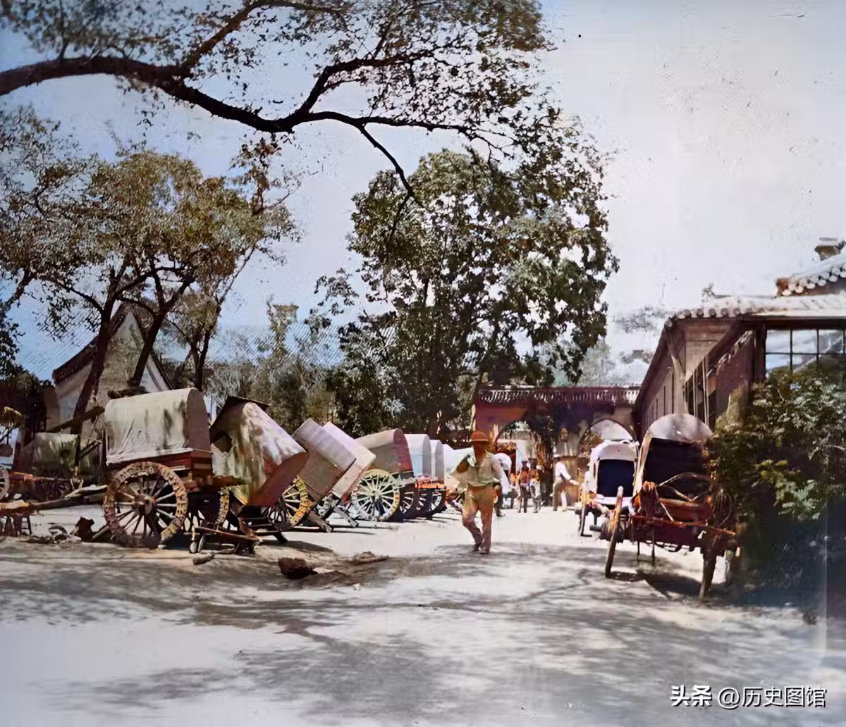 這張照片拍攝於北京當時的使館區。一些建築掩映在綠樹叢中,在使館區門前的廣場上,停著很多載人的馬車,一名外國人從馬車旁邊走過。