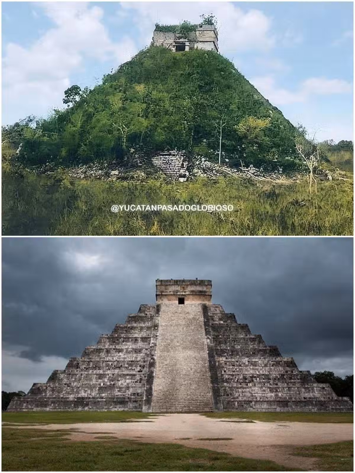 還沒有進行清理和挖掘時的瑪雅金字塔,幾乎完全被樹木和雜草覆蓋,還保持著原始的神秘感…