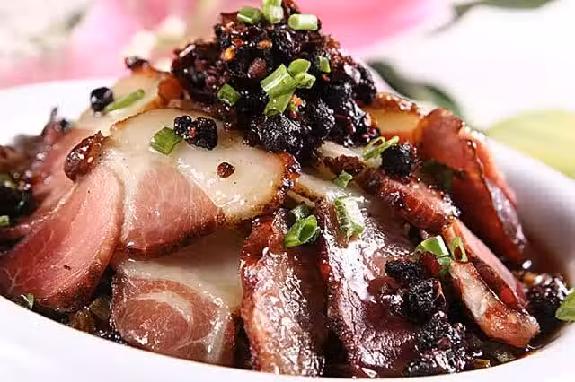 2. 豆豉用色拉油炒香,盛入盤中,再將醬豬肉片整齊地擺在上面,調入味精,放入蒸籠用大火蒸5分鐘即可。