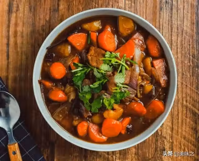 8、把炒好的牛肉放入鍋中,加入適量的開水,再加入土豆和胡蘿蔔,開水剛好浸到所有食材。大火煮開後加蓋小火燜煮40分鐘。