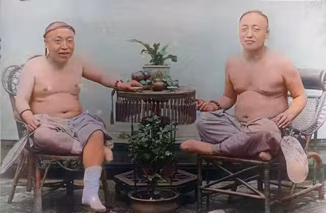 炎熱的夏天,兩個男人光著膀子坐在院子裡納涼。兩人又寬又胖,看得出家世不錯。他們坐在藤椅上,茶几上放著茶杯,手裡拿著扇子。