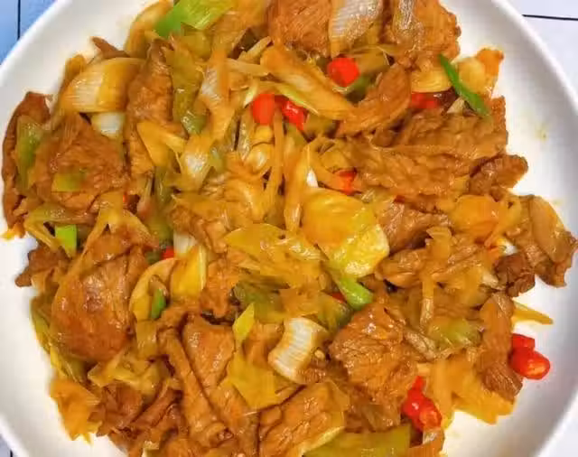 (3)鍋中熱油爆香小蔥和小米辣,下入腌制好的牛肉翻炒變色。