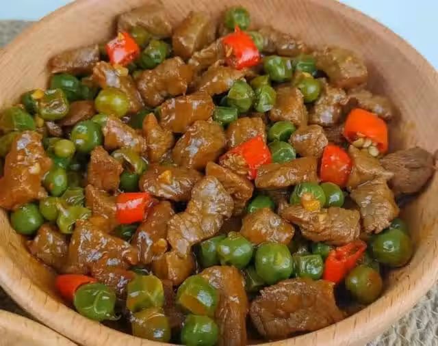 (4)鍋底留油爆香蒜末和小米辣,倒入牛肉丁和豌豆粒翻炒片刻。