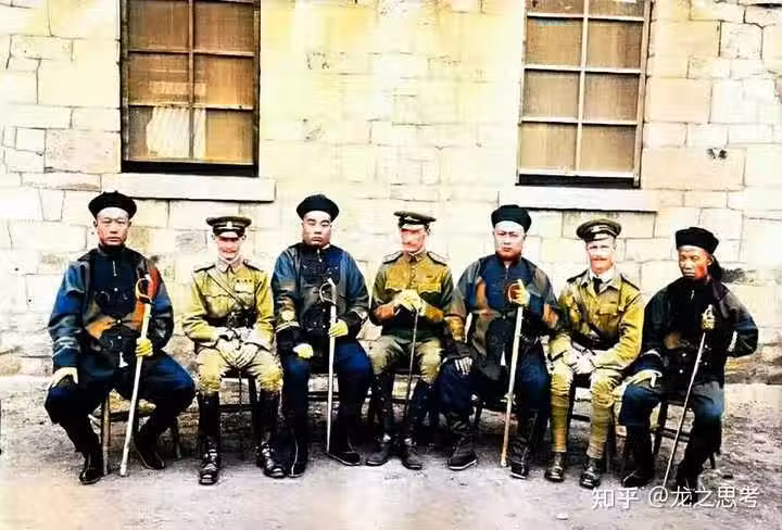 上圖是清朝海軍與不知哪國海軍的合照(老照片上色)。