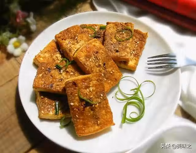 1、滷水大豆腐切成將近1厘米厚的方塊。塊的大小可以調整,但厚度不要超過1厘米。