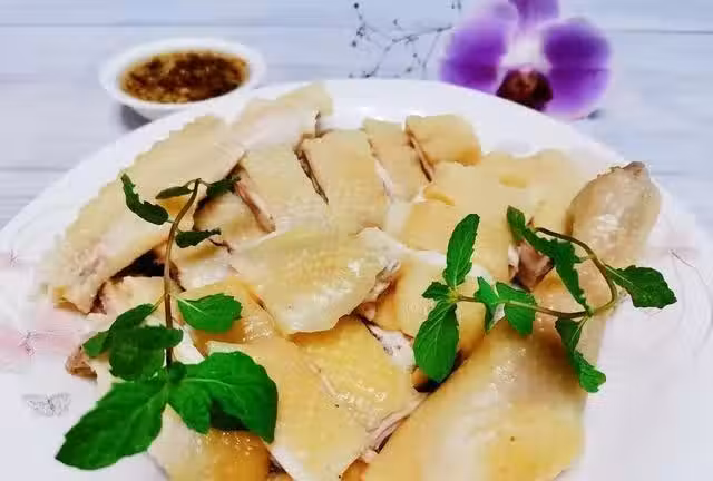 12.雞肉鮮嫩,煮熟冷卻後,皮爽肉滑,色澤金黃油亮,食用時配以豐富的蘸料,香、辣味恰到好處,十分可口,一口一口停不下來呀!再教大家一招:吃不完的白切雞,用剩餘的蘸料腌制一晚,第二天超好吃,肉質硬了,搭配白粥,爽!