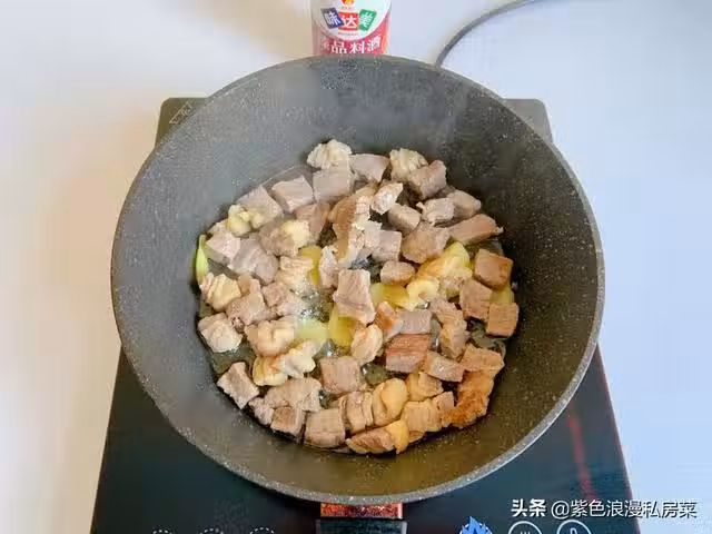 3.鍋中放油,放薑片爆香,放牛肉翻炒。