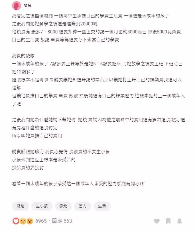 沒錢別生孩子?16歲堂妹「月賺8千養自己」還要付學費 崩潰喊「根本來受苦的」:比成年人還要累