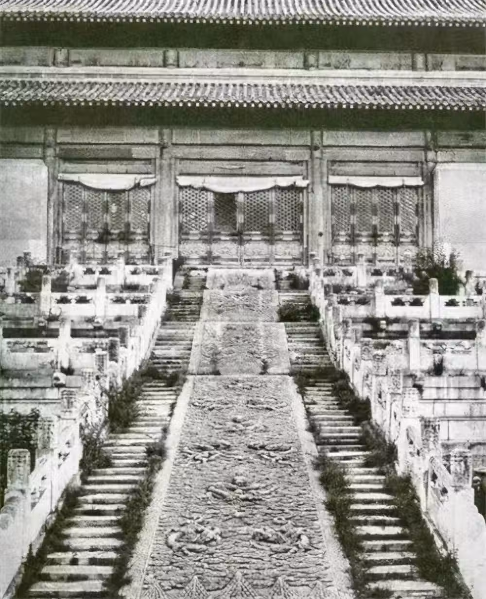最搶眼的並非龍椅,而是建築的層高,和用到的柱子,樑柱高達大,兩個成年人都不一定能夠完整的圍住,在這只上面,盤著龍,從老照片中看不到他的顏色,但是這已經相當震撼了。
