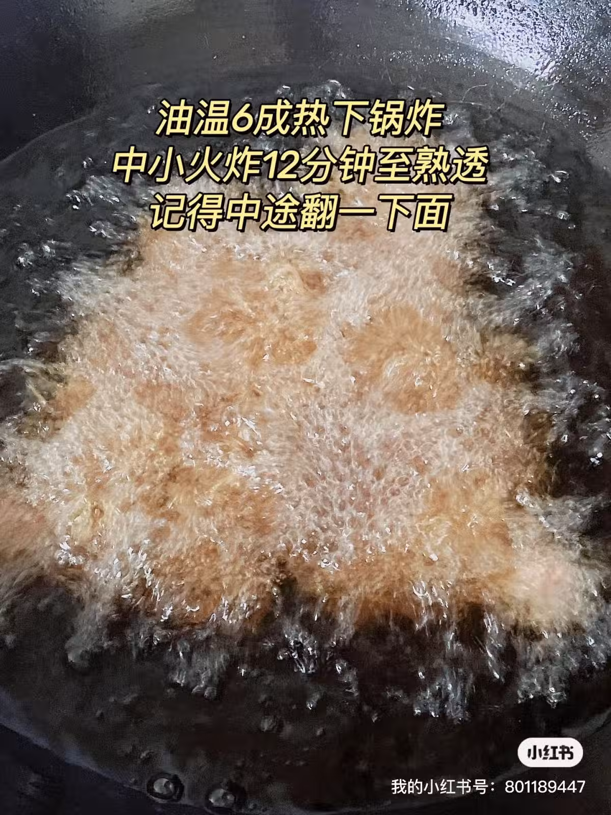 3️⃣油溫6成熱下鍋炸,中小火炸12分鐘左右差不多熟透