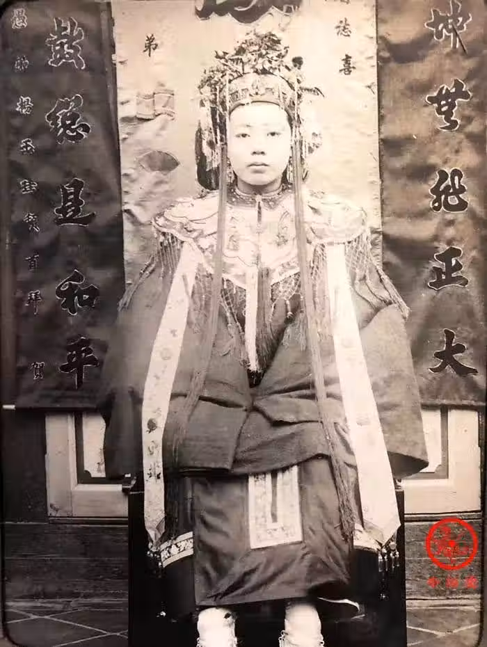 傳統的新娘禮服都是大紅色,光彩奪目。遺憾的是,這張黑白照片無法還原新娘服裝的絢爛色彩。朋友們,你結婚時,願意(或者願意讓你的新娘)穿上這樣的紅妝嗎?據我觀察,最近2年,婚禮上穿紅妝的多了起來,穿西式白色婚紗的有所減少。