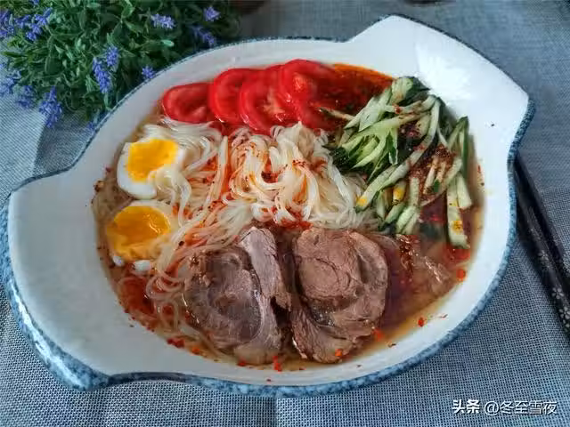6.把調料湯倒入裝冷麵的大碗內,再依次擺上雞蛋、牛肉片、黃瓜絲、西紅柿片、按個人口味淋入辣椒油,吃時拌一下就可以了,一碗色香味俱全的朝鮮冷麵就做好了,是不是很簡單呢。想吃的再涼爽一些的,可以再放入一些碎冰塊,吃著口感更好,如果胃不好的人,建議就不用放碎冰塊了。
