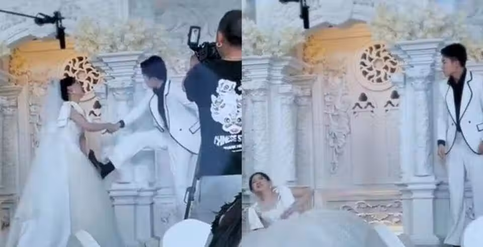 結婚喜宴原本應該是充滿幸福喜悅的氣氛,但中國一對閃婚新人卻突然發生兇暴動粗場面,原本上一秒還表情開心的新郎,下一秒卻突然怒氣沖沖地一腳把新娘踹倒,讓眾人十分傻眼。