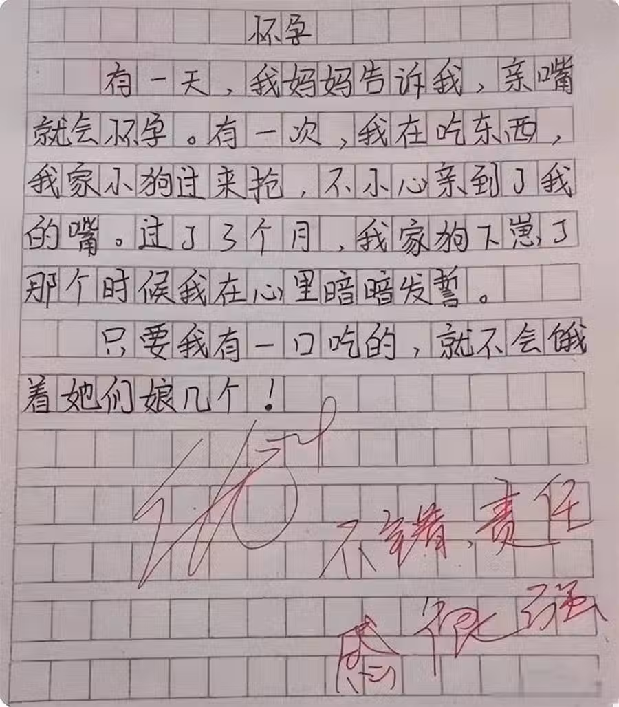 哈哈哈,家長看到這篇作文,可能都要笑到拍大腿了,小孩子太萌了!關鍵是老師還很認真的評語了,直言孩子「很有責任感」!