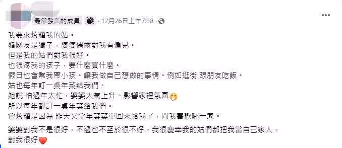 而貼文一出,網友也備感溫馨:「很棒,遇到能互相的小姑,她媽媽就讓她們去治」、「應該懂得她家老人的行為舉止,不讓別人牽累到,這種姑真的很不錯」、「好羨慕」