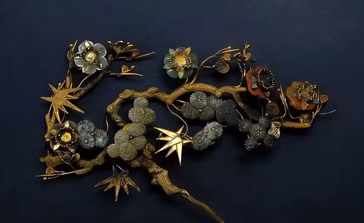 女子頭上佩戴的是赤金鳳冠,上面鑲嵌著珍珠、瑪瑙、綠松寶石,還有七件金簪。