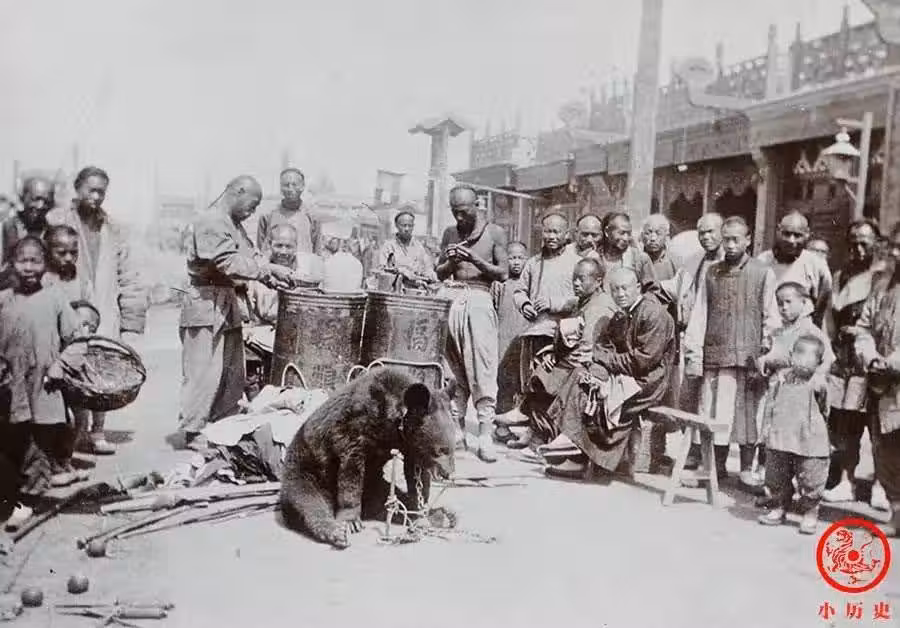 一隻熊正在賣力地做動作,討好著圍觀的人群。那時候人們沒什麼文化娛樂項目,看看馬戲就是難得的休閑了。當然,以現在的眼光看,動物表演應當進行限制或者禁止。