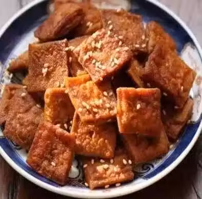 白豆腐乾一斤、糖3大匙、金蘭醬油1大匙、鹽1小匙、橄欖油適量、熟芝麻少許