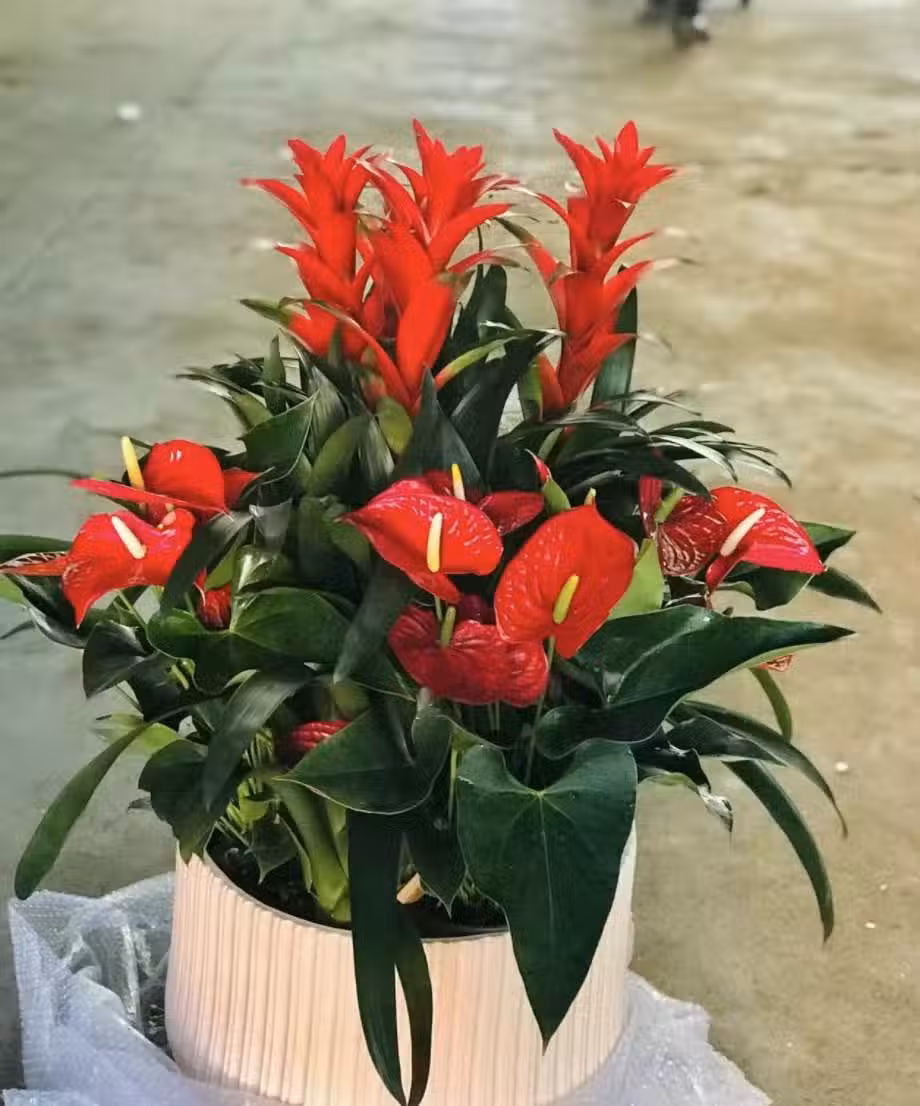 鴻運當頭也稱為火輪鳳梨,它是一種多年生草本植物,屬於雜交品種。火輪鳳梨的造型優雅別致,葉片柔中帶剛,表皮光亮,花朵長在葉片的頂端,猶如萬綠叢中一點紅。