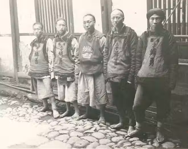 這張照片攝於1909年。他們的胸口上寫著「灌縣正堂緝勇」字樣,以示他們的身份。 緝勇即捕快,並負責偵查案件和逮捕罪犯。 他們一年的「工食銀」只有十兩銀子,很難養家餬口,所以敲詐勒索已經成為一種風氣,他們經常設立各種名目來收取收益。