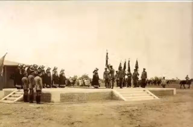 閱兵後,作為總指揮的載灃給軍官們授旗,你看圖片左邊站著的是穿著清朝官服的官員,右邊是穿著現代軍裝的士兵,頗有時代割裂感。