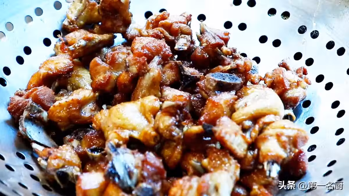 4,另起鍋燒油,倒入花椒和紅辣椒爆香,把水分炒干,倒入蔥姜翻炒,再倒入炸好的雞塊,開小火,翻炒一分鐘。
