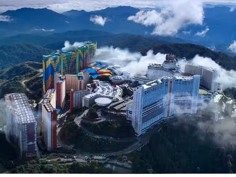 纜車越往上走就感覺越陡峭,就好像在雲霧繚繞中,山巒重疊,林木蒼翠,花草蓊鬱茂盛,空氣清新宜人,雲頂的建築群位於1772米的烏魯卡里山,景色令人神往,娛樂設施齊全,山頂有人工湖,環湖火車,高爾夫球場,溫水游泳池,吊橋。 還有小溪流水,也可以划船,山上有三個現在化的大旅館,有的高達十八九層。 在雲霧的環繞下,猶如雲海中的蓬萊仙閣,還好像海市蜃樓,在這裡可以飽覽雲海霧浪變幻莫測的景象奇觀。