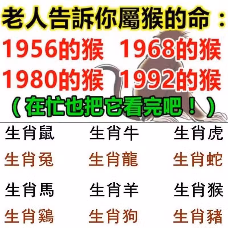 老人家偷偷告訴你:屬猴的命:56、68、80、92年,在忙也要把它看完吧!