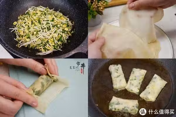 5、平底鍋中加入適量的油,擺上春卷,煎至金黃後翻面,直到兩面金黃即可。