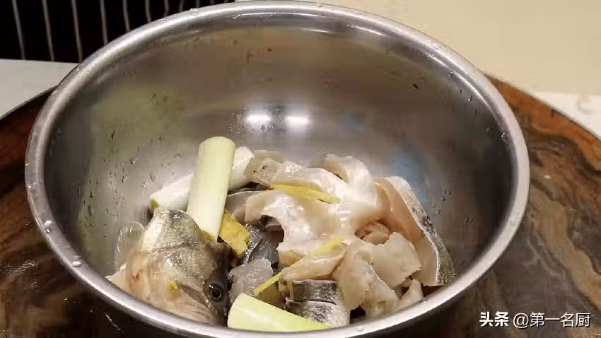 2.魚肉裡面加入蔥片,薑片,食鹽,胡椒粉,料酒各適量,用手抓拌均勻,腌制5分鐘,使魚肉慢慢入味。