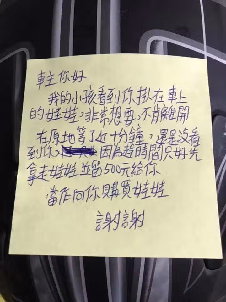 重機後座掛娃娃!家長喊小孩想要「留完紙條就拿走」,車主傻眼「調監視器找到人後」決定算了😮