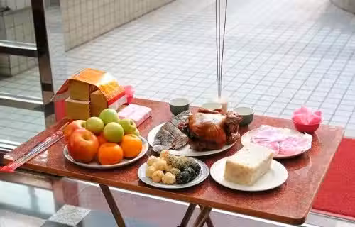 除夕拜地基主時,通常會選擇傍晚的時間,準備三牲五果、五味飯、三杯茶或酒,由屋內向屋外祭拜,又稱為「拜門口」;至於祖先方面,則是準備豐盛的團圓飯、糕餅、三杯茶或酒,並在供桌擺上幾副碗筷,請家中所有的人一起拿香祭拜,邀請祖先們一同回到家中共進團圓飯。