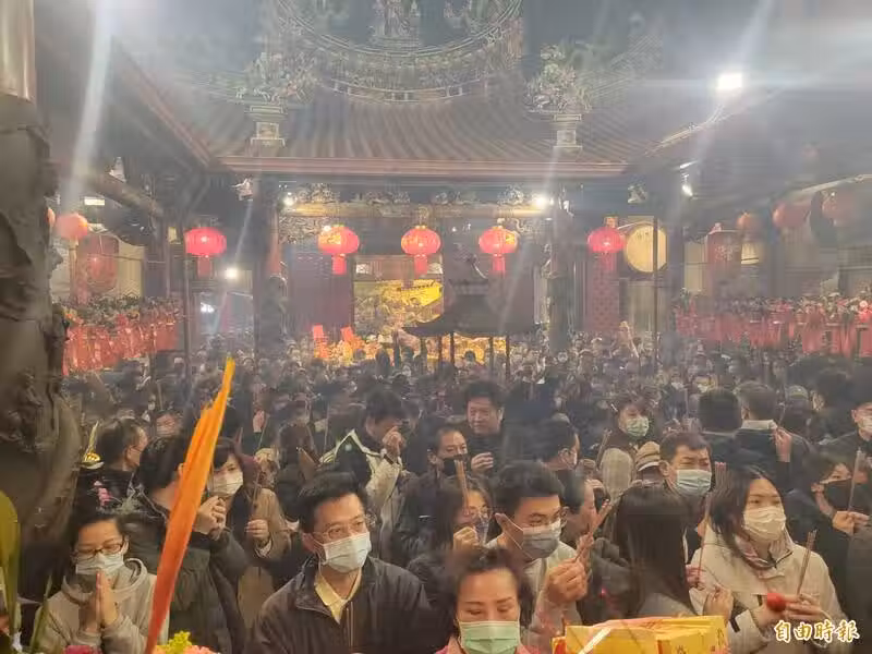 民眾手持香站在屋內,將供桌與供品朝外擺設,人由內向外祭拜。