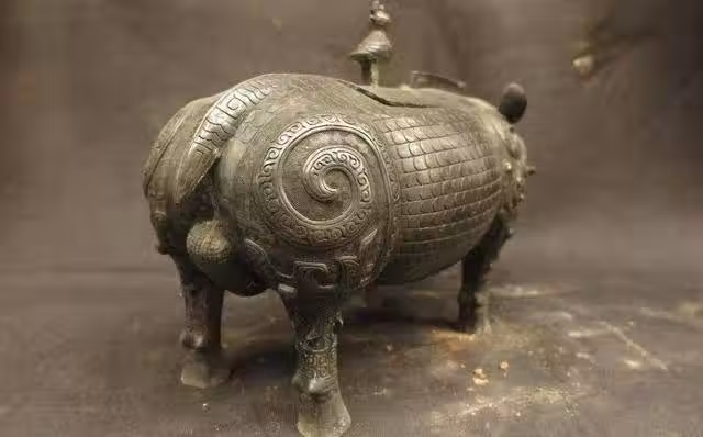 而之所以以野豬為器物形制,是因為商周時期的象生動物具有表意的功能及象徵的意味,作為人們與神靈溝通的媒介,起著娛神和避邪的功效。當然,這件青銅器也有其現實功用,那就是作為「酒器」,可以供人們儲酒用。此器重達30多公斤,容積有13公升,盛滿後,一個人都難以搬運。其背部的橢圓形孔,是酒器的出口。由於豬尊盛酒後難以倒出,所以應該配有取酒的勺。