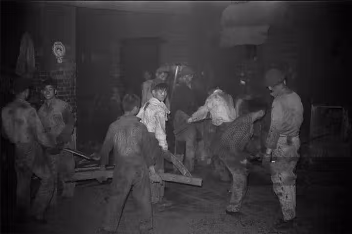 3、一處鐵工廠的童工在惡劣的條件下作業。由於家貧,不少孩子國小畢業後即被迫工作,失去教育的機會。