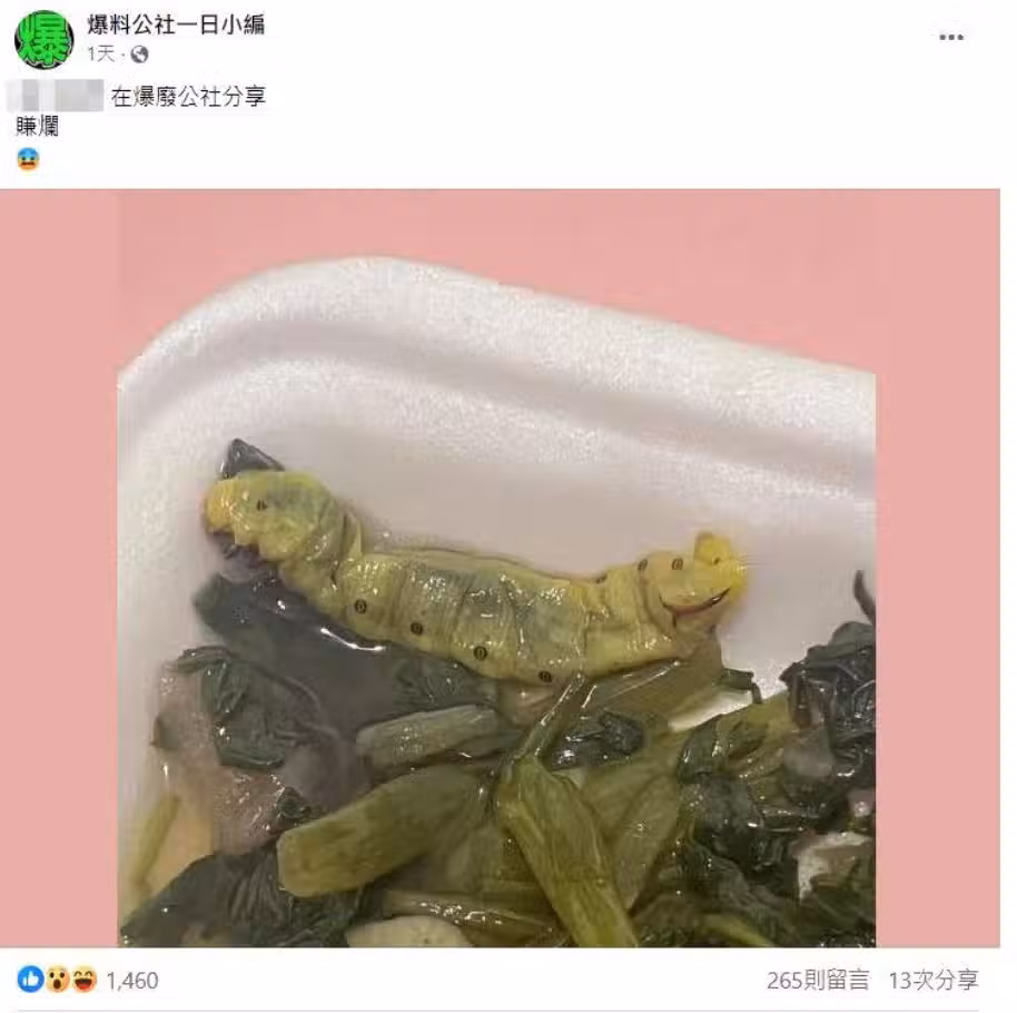 點燙青菜見「粗大毛毛蟲」橫躺餐盒裡!網友「見1亮點」崩潰:要吐了